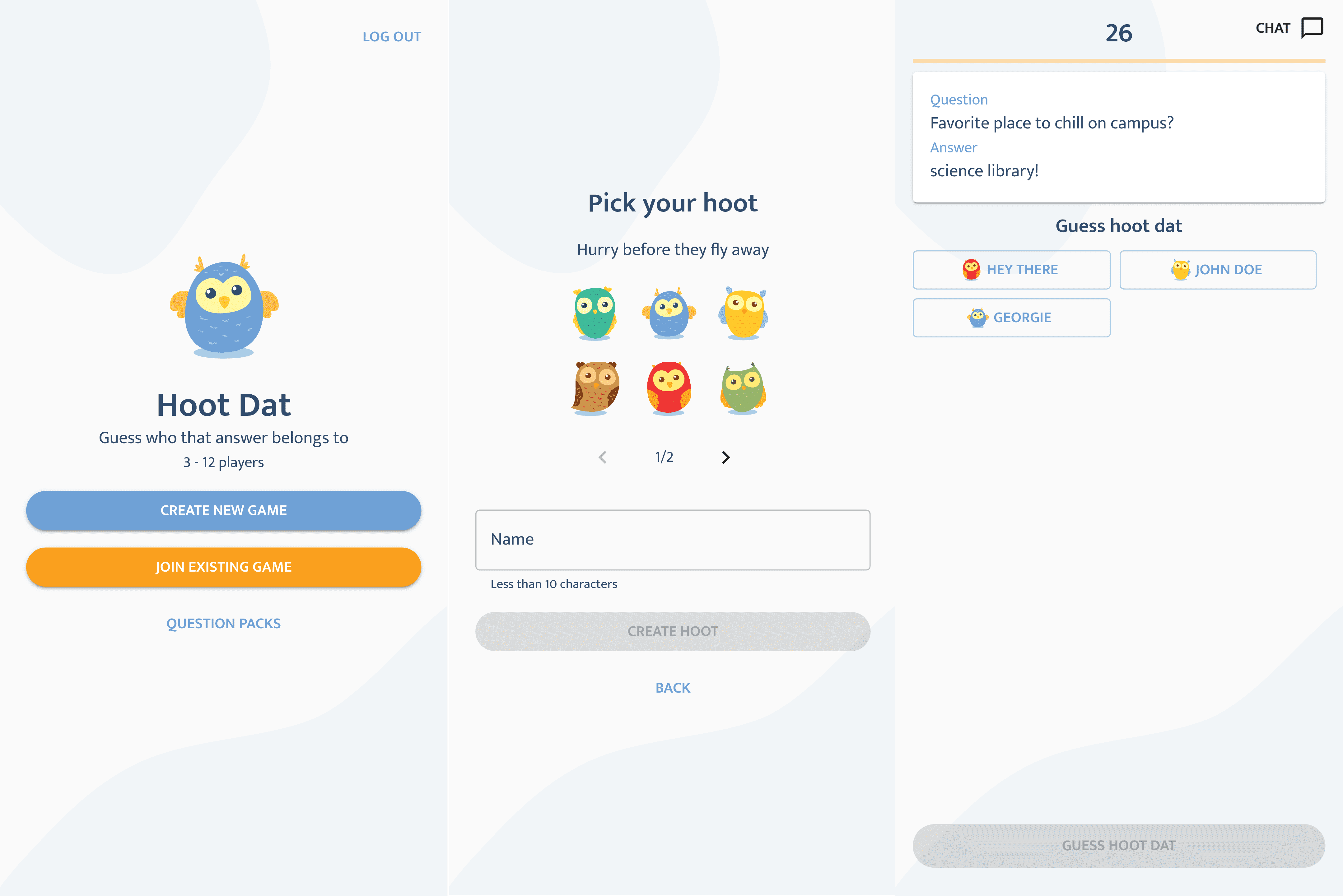 Hoot Dat is a real-time multiplayer question-and-answer guessing game where in each round, a player (answerer) - unknown to the rest - is randomly selected to answer a question. After the answerer has answered the question, the other players (guessers) have to guess who answered the question while a timer ticks away..