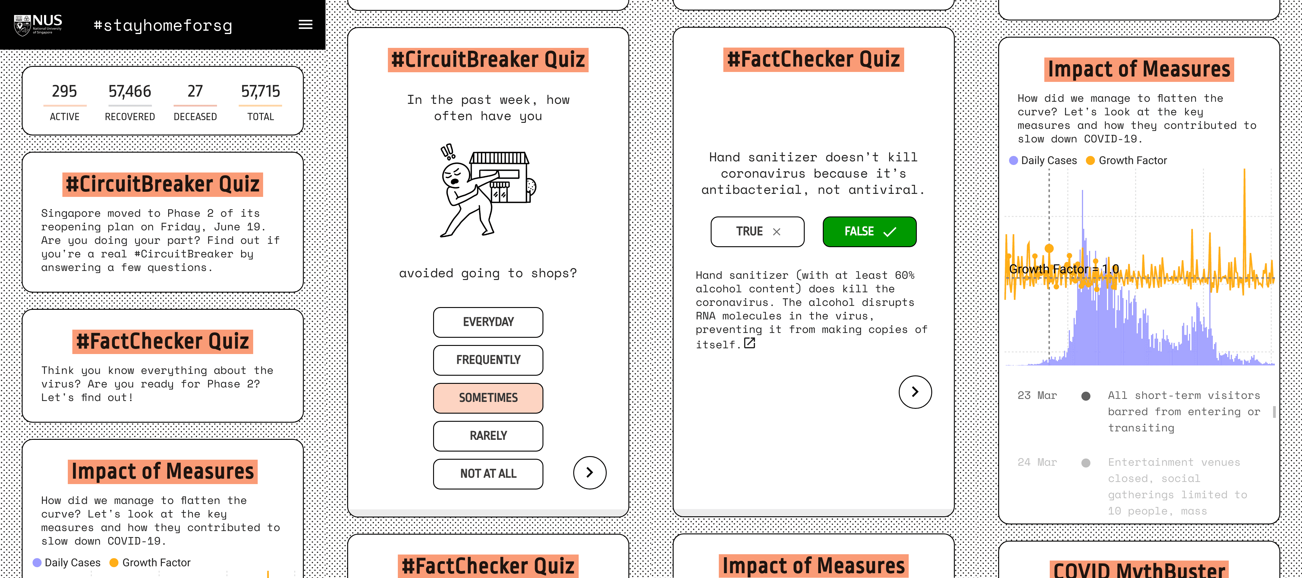 #StayHomeForSG is a fullstack project I built for a client aimed at raising awareness of the COVID-19 situation in Singapore. It aggregates health data from various sources and presents the user with some informative quizzes. Working together with a UI/UX designer who created the designs, I coded the frontend in React (NextJS) and backend in python Flask which scrapes data from various websites using the BeautifulSoup4 library. The scraped data is cached and rescraped on a daily basis so the data displayed is only accurate to the day (which is sufficient for our purposes). You can check it out here!